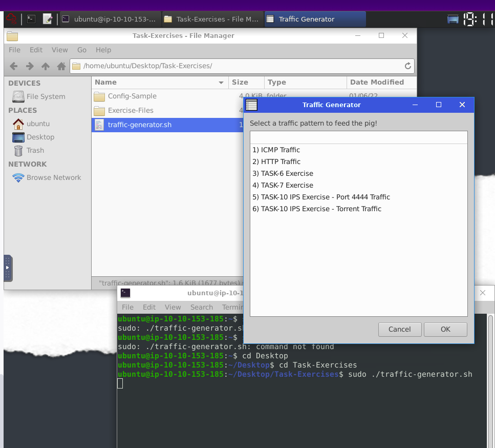we can run this command to generate traffic to the interface. It will ask you to choose the exercise type and then automatically open another terminal to show you the output of the selected action.