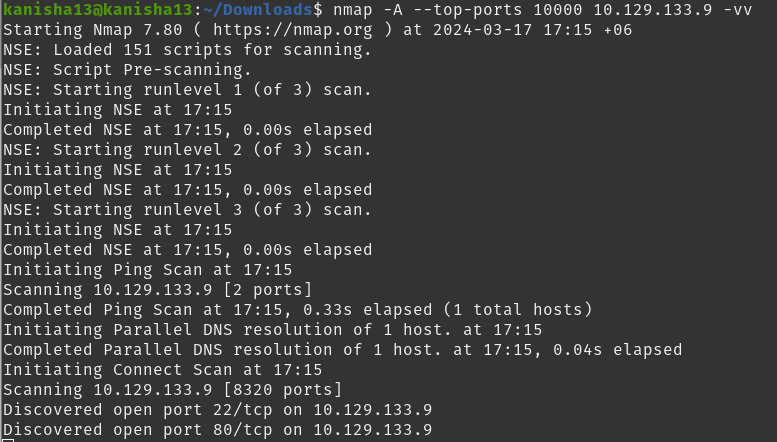 nmap -A –top-ports 10000 10.129.133.9 -vv