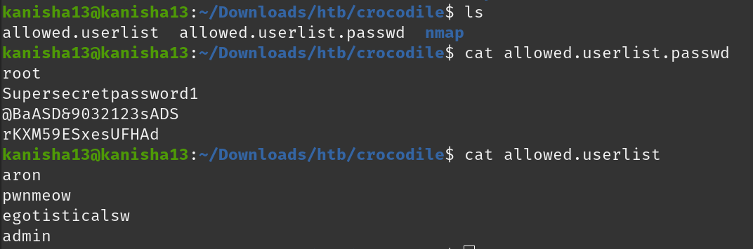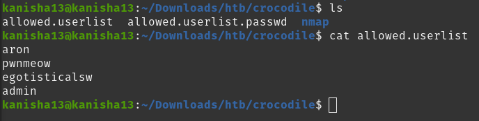 To find this i first ftp-ed the target ip and logged in as anonymous user and found two files. I downloaded the files and looking at the contents of ‘allowed.userlist’ i found the following