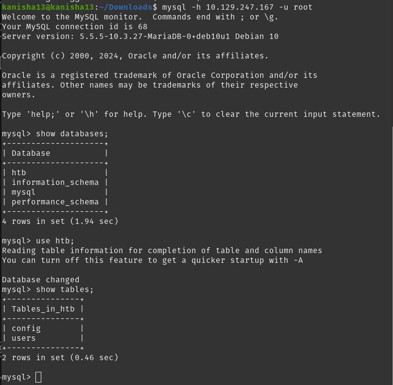Uing the root username we logged into the MariaDB