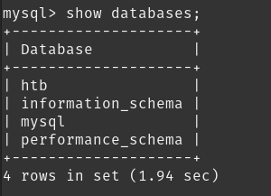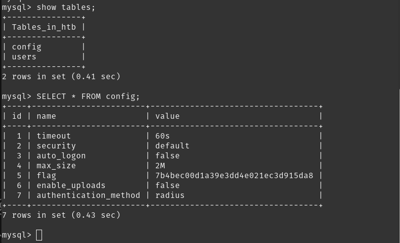 To find the flag i used the htb DB to see the tables present in it and selected all values from the config table and found the flag.